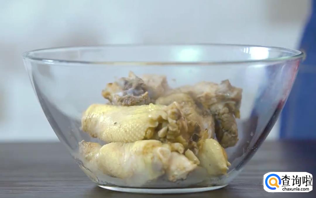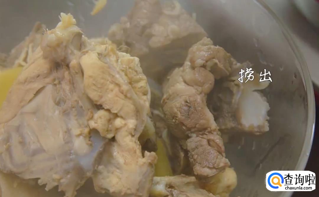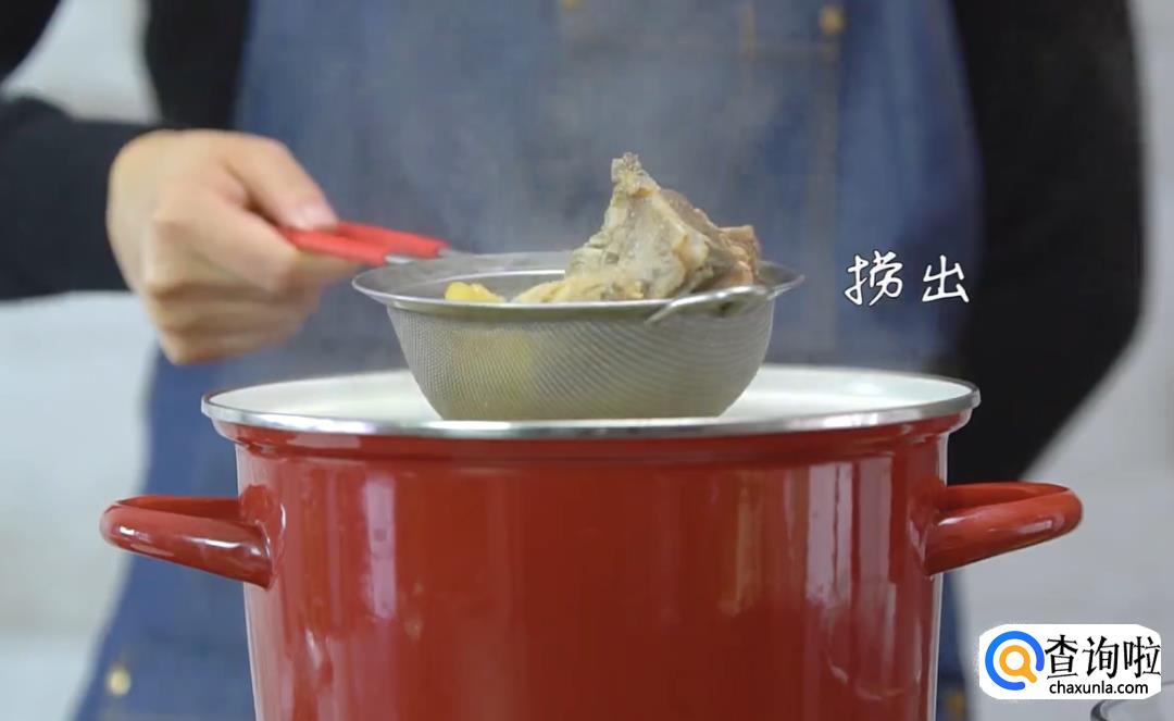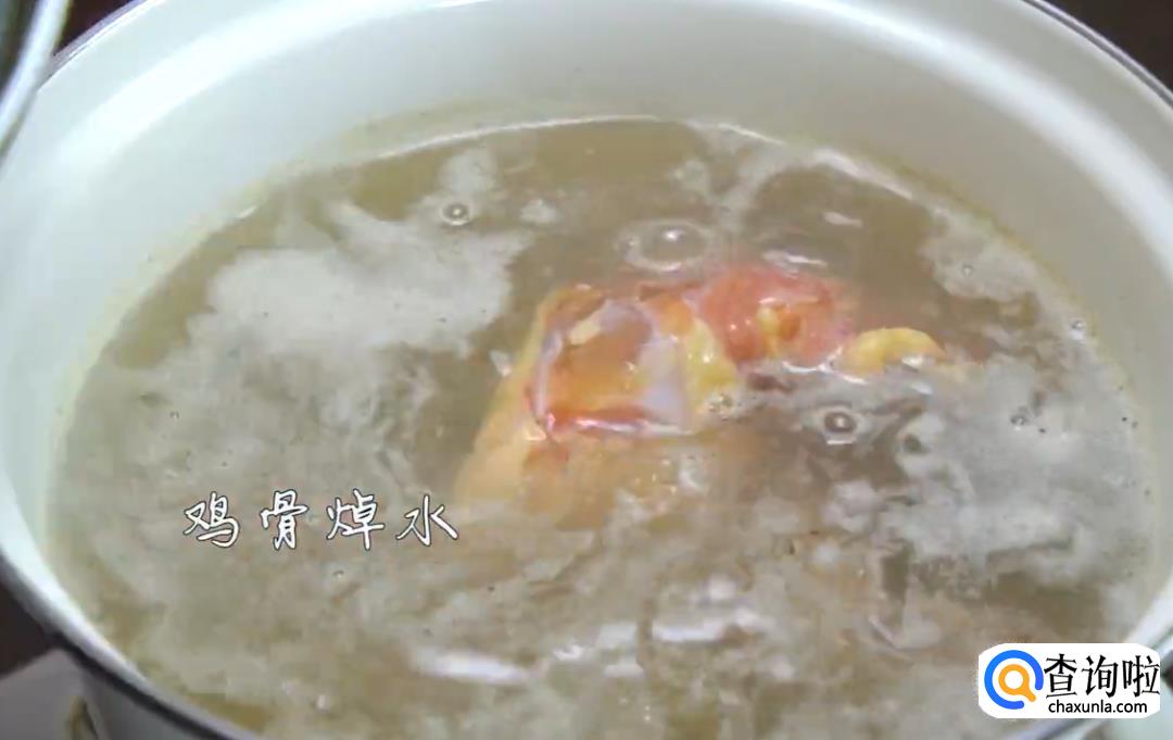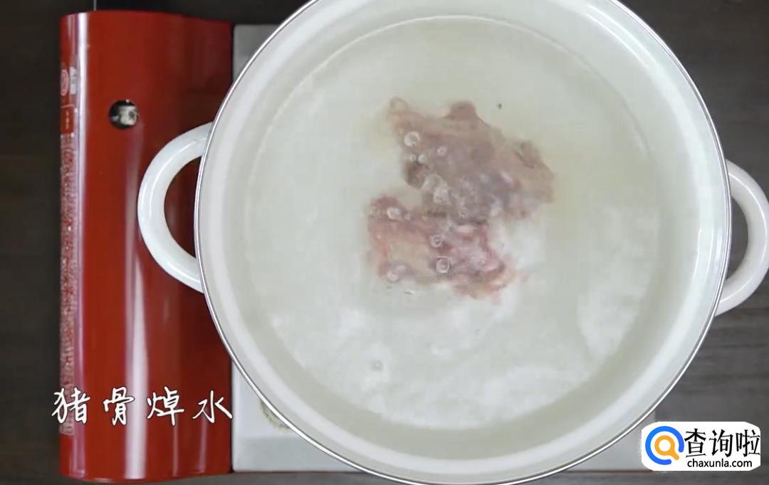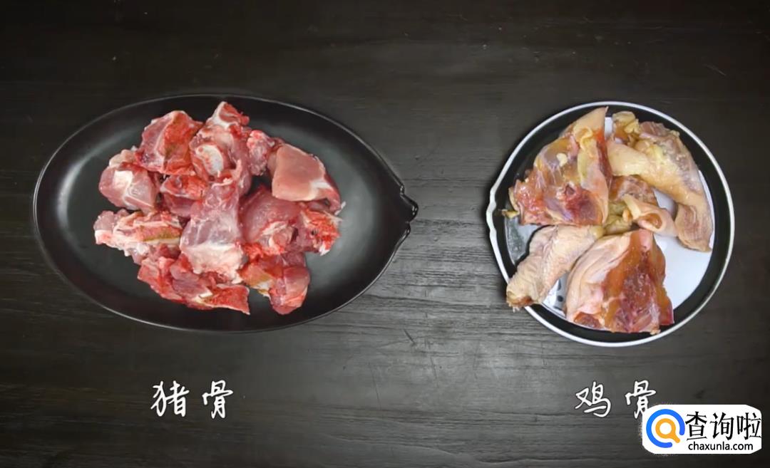 将猪骨和鸡骨焯水(煮约5分钟)后夹出备用。