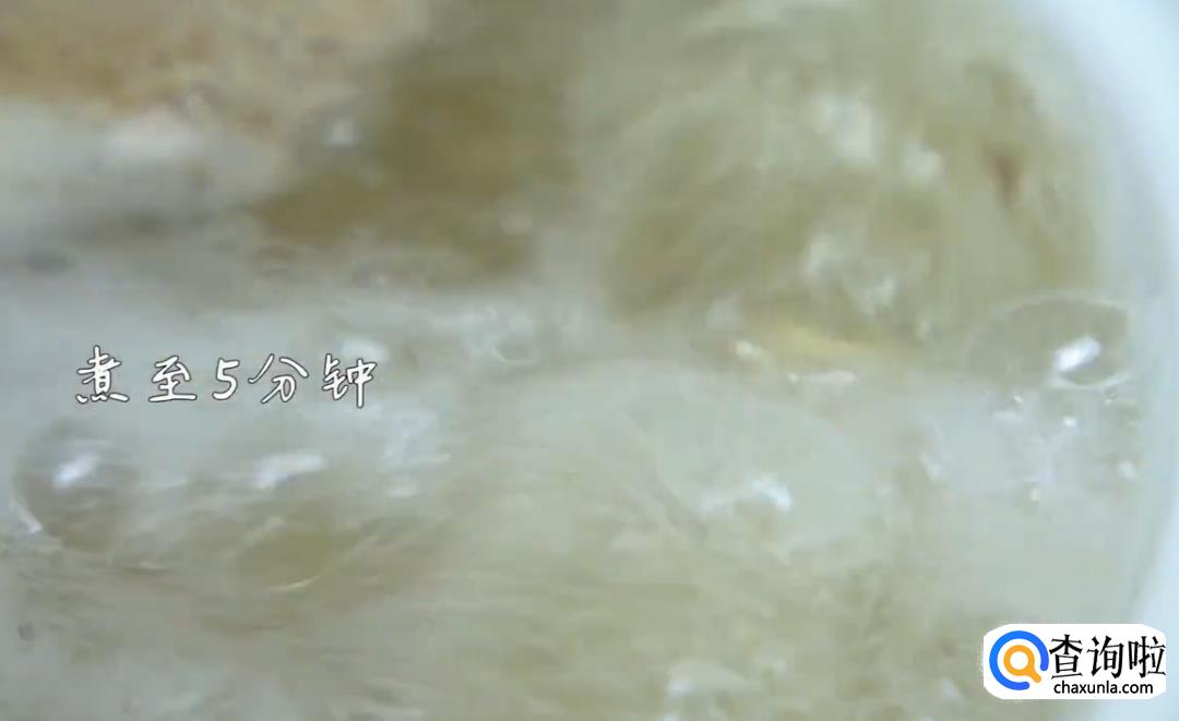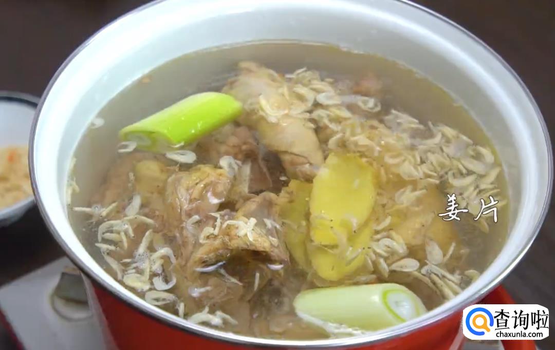 另起一锅,放入清水、焯过水的骨头、虾米、葱段、姜片,大火煮沸后转小火,熬煮约40分钟。