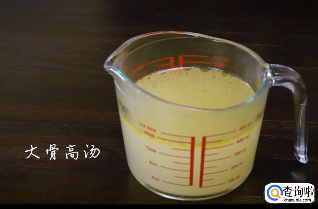 捞出锅中的骨头、虾米、葱段、姜片,仅留大骨高汤备用。