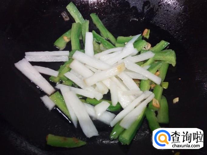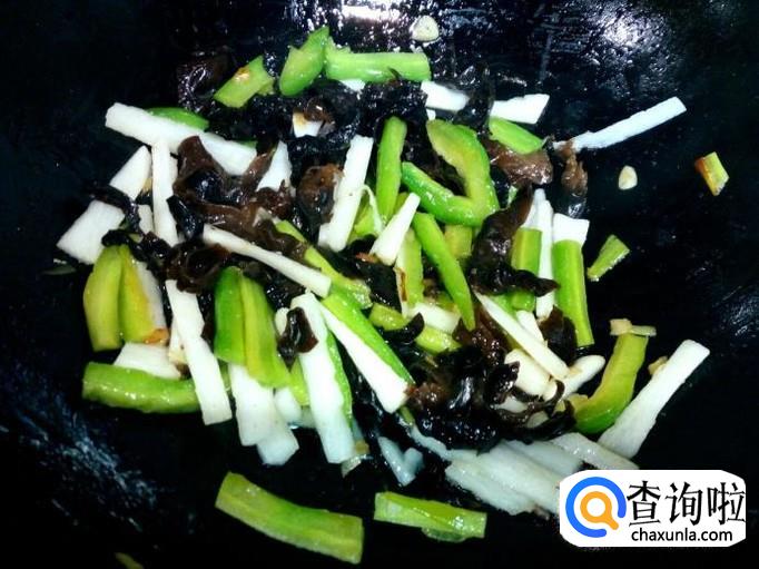 苦瓜略翻炒一下,放入山药翻炒,放入少许料酒,滴少许醋,放少许白糖(醋和糖要根据个人喜好的口味)。山药略翻炒一下,放入木耳翻炒,放入盐。