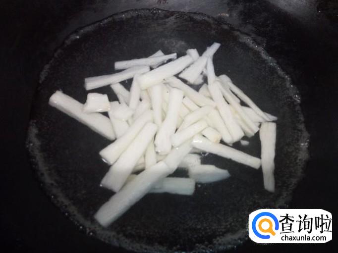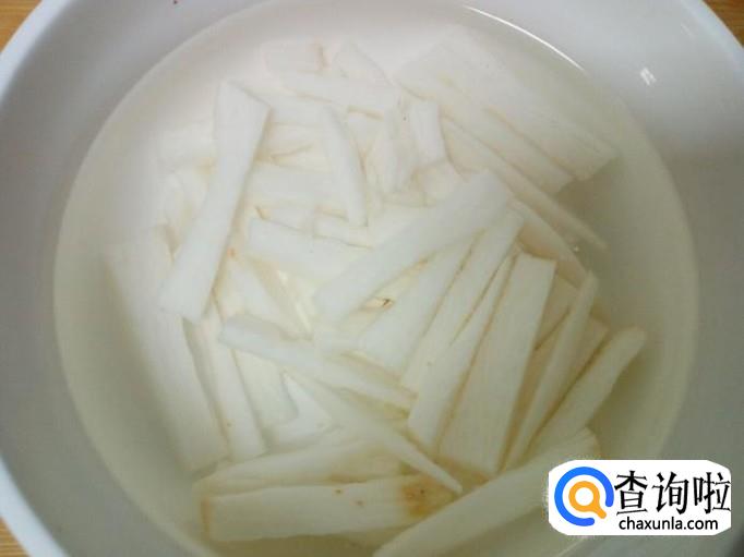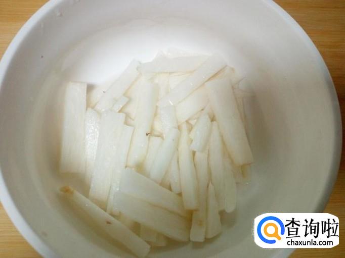 山药去皮,用水清洗干净,控干水分,切成条。放入水中浸泡一下,然后用水投洗一下,控干水分。