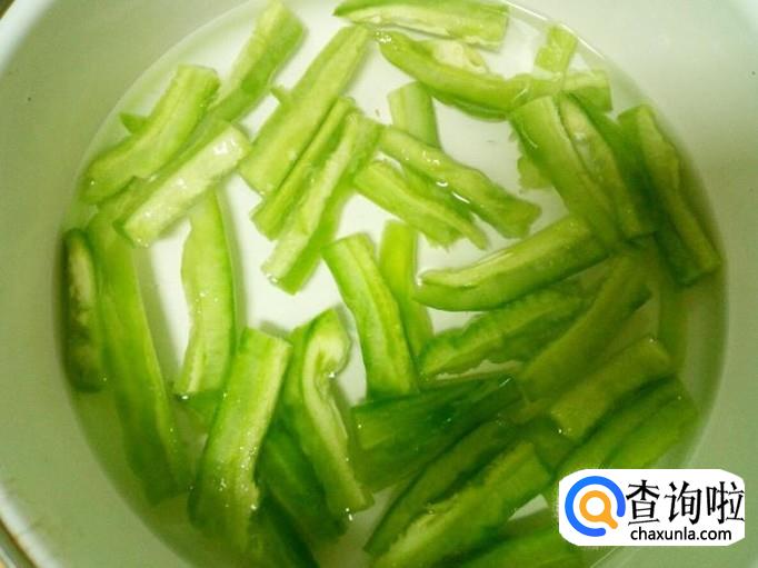 苦瓜去瓜瓤,用水清洗干净,控干水分,切成条。放入水中浸泡,去除苦味,然后用水投几遍,控干水分。