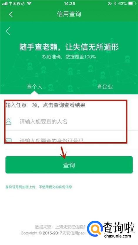 如下图,输入对方的姓名和身份证号码,并点击查询。
