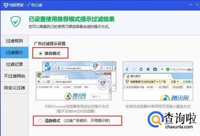 点击左边的过滤提示,两种模式选择一种都可以,一般选择推荐模式即可,一般这样布丁新闻就不会弹出来了。