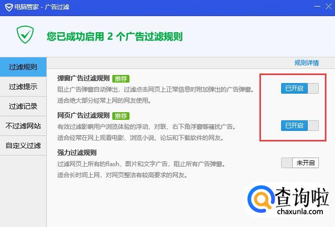 将弹窗和网页广告的开关都打开,拦截这两样广告。