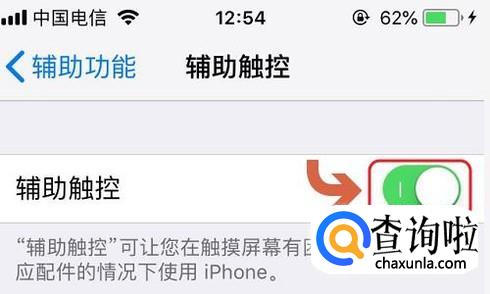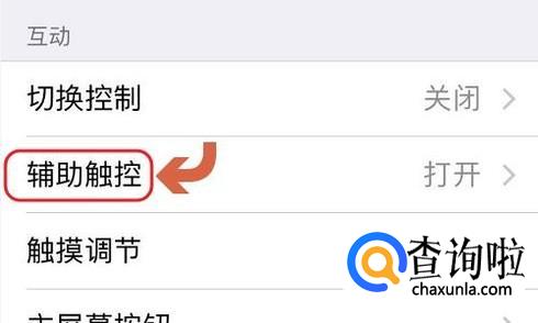 在辅助功能页面中选择“辅助触控”(有的版本名为AssistiveTouch),然后我们将该项右侧的开关打开,如图所示;