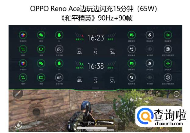 实际的效果也让我们相当惊喜,无论是90Hz+60帧还是60Hz+60帧模式,OPPO Reno Ace维持上边续航测试的设定,边玩《和平精英》边闪充15分钟均充入了30%的电量。
