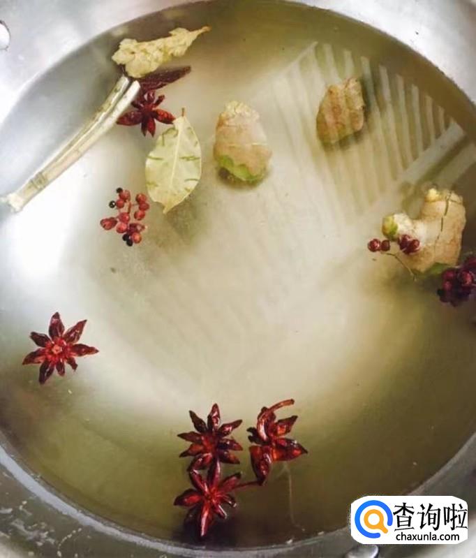 锅中加入足量的清水,放入大料、花椒、姜、香叶、茴香梗、盐煮沸后再煮20分钟左右