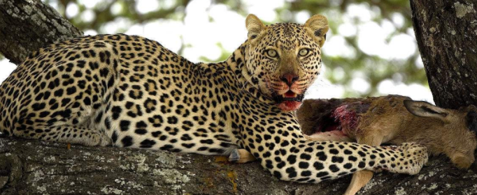 金钱豹,就是我们一般称为花豹、豹子的那种相对普通的豹,由于其灰黄色的身体上布满古钱状花斑而得名。金钱豹有20多个亚种,其分布范围也极其广泛,从俄罗斯到东南亚,从北非到南非,甚至中东都有它们活跃的身影。它们主要在森林的边缘地带活动,其周边环境中总离不开高低不等的树。当金钱豹狩猎成功,特别是捕杀到如斑羚、野猪、鹿等一些大型动物时,并不会像它的亲戚猎豹那样当场狼吞虎咽,而是耐心地将猎物拖回到邻近的树上,然后慢慢地享用。这是为什么呢?