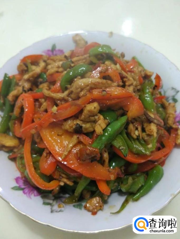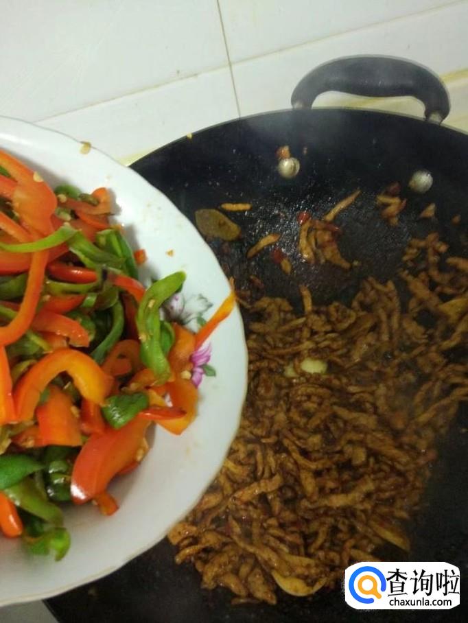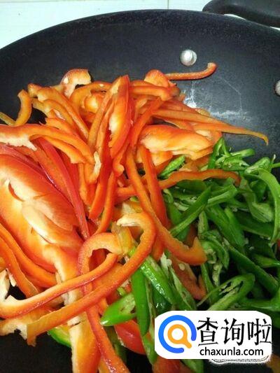 加入刚才去掉水分准备好的青椒和红椒丝