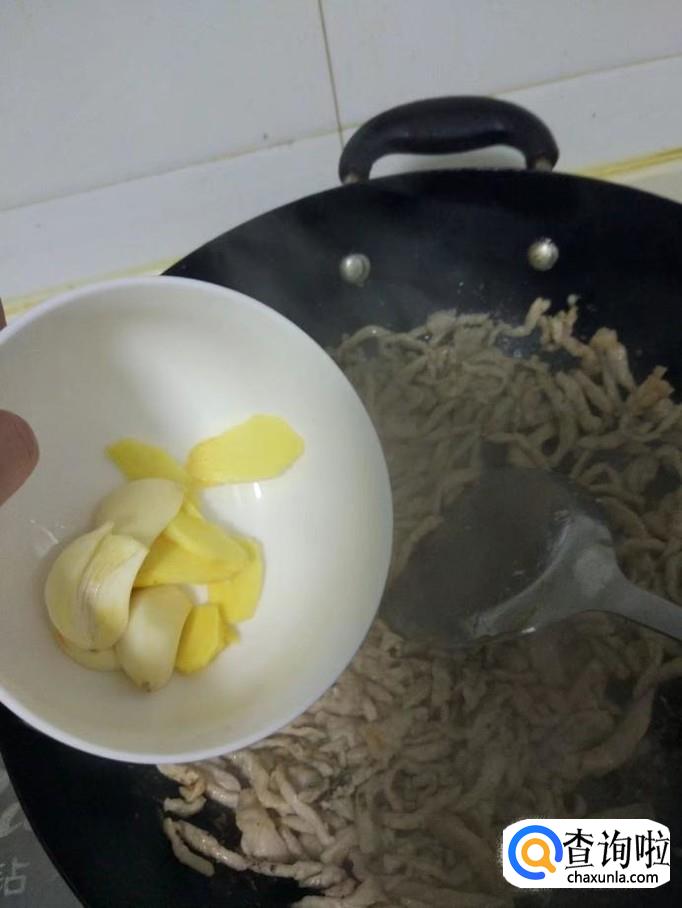 肉丝中放入准备好的蒜片和生姜