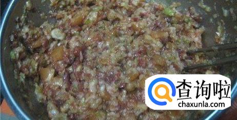 将切碎的白菜叶和放过调料的羊肉馅搅拌一起,放入搅拌均匀,再拿出准备好的饺子皮包饺子。