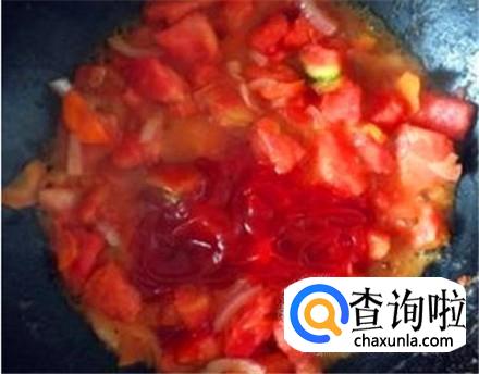 锅里倒油烧热,放上西红柿翻炒出红油,加上洋葱和红肠、卷心菜继续翻炒,然后加入清水,倒进去一些番茄酱。