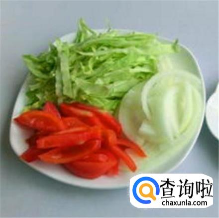 各类蔬菜准备好,洋葱切条,卷心菜切块,西红柿切小块。