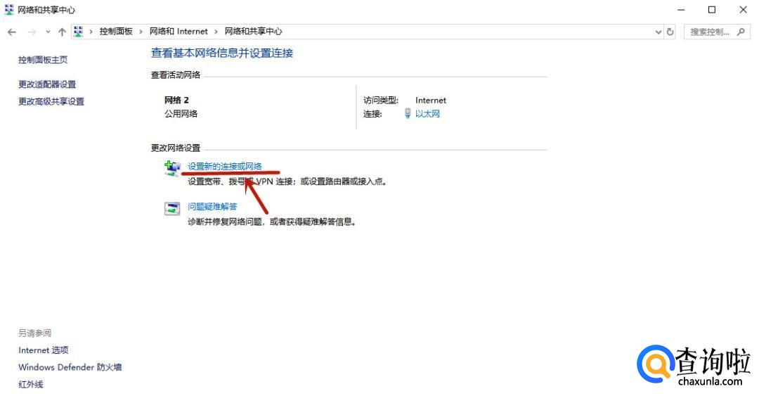 进入后可以看到红箭头标出的“设置新的连接或网络”,确定点击。