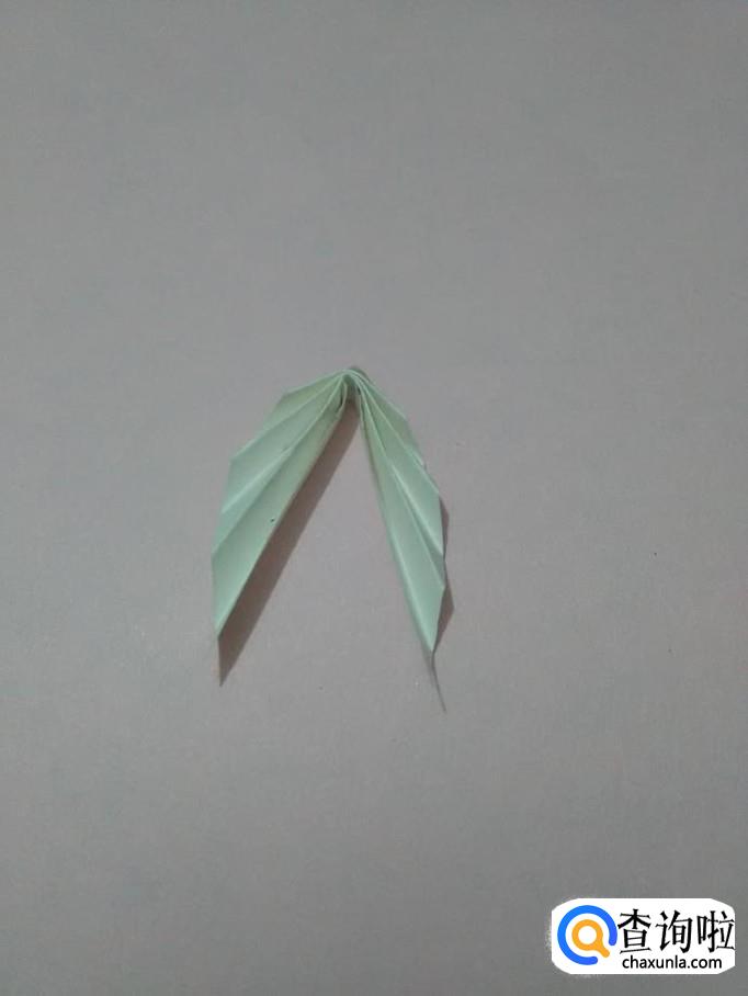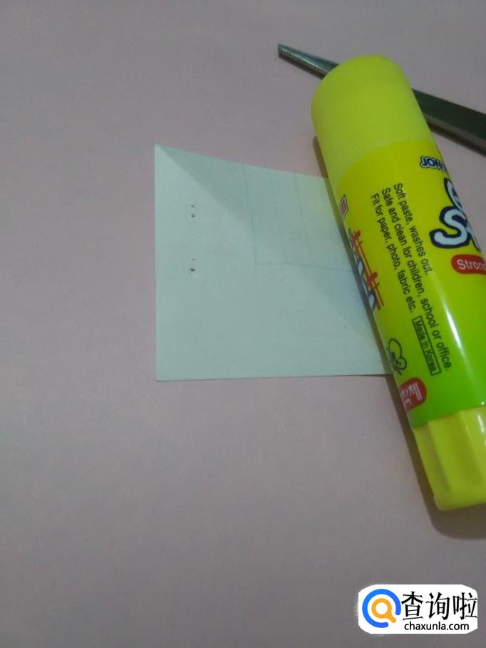 把小纸条从折好的纸中间穿过,两端用胶棒粘好,上方的叶子部分也用胶棒粘好,一片好看的叶子就折好了。