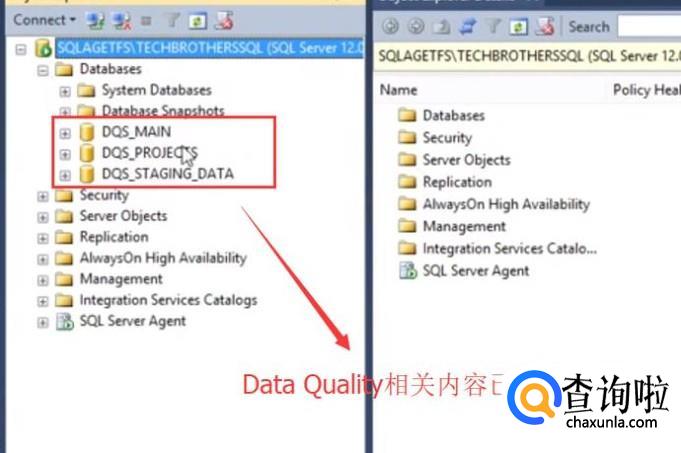 最后我们重新回到SQL Server 2014管理主界面,这时我们在数据库文件夹下面就会看到Data Quality相关的内容了,如下图所示