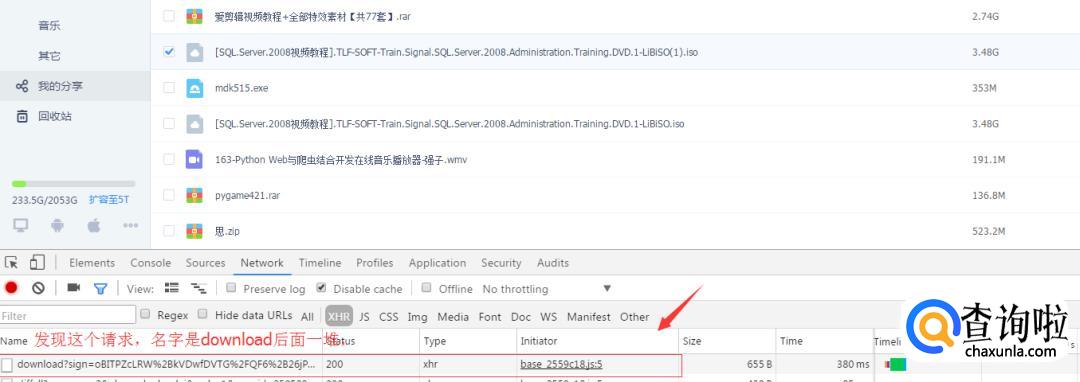按键盘上的F12键,选择“Network”, 下面的“XHR请求”,会弹出启动百度云网盘的提示,说明我们已经向服务器发送了请求并得到了响应,然后将XHR里面的内容清空。
