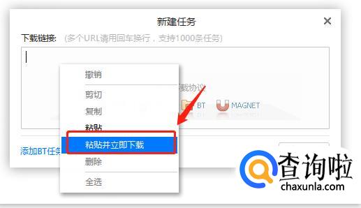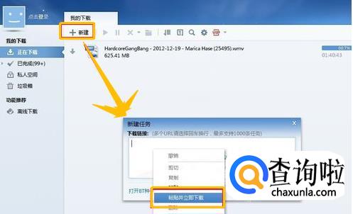 打开迅雷的新建面板,点击鼠标右键选择“粘贴并立即下载”。