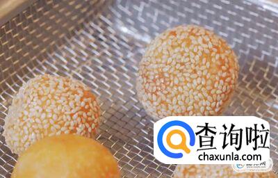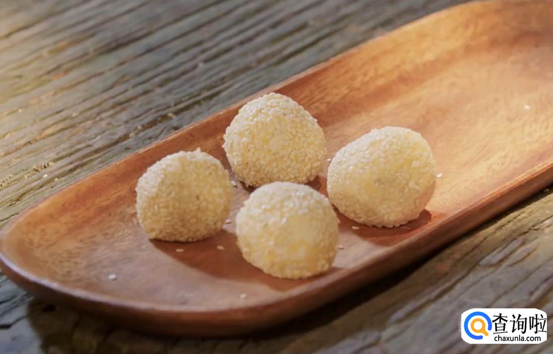将圆球压成面皮后,加入黑洋酥,搓成丸子后裹上芝麻。