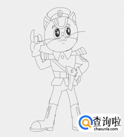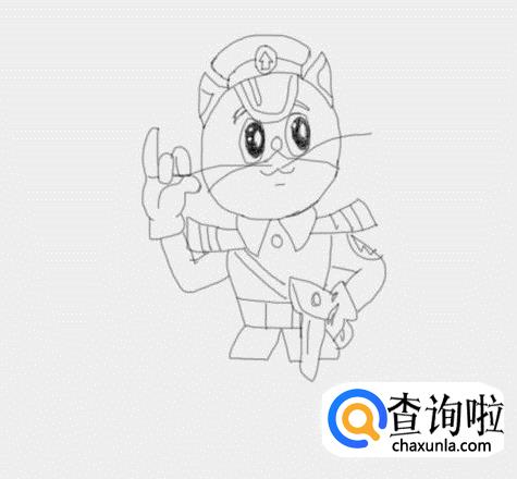 再在两只胳膊的基础上画出黑猫警长的身体及衣服,然后再画出其装备,如图所示: