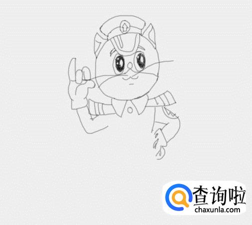 在头部下面画出黑猫警长的脖子及衣领,然后再画出黑猫警长的两只胳膊及手部,如图所示:
