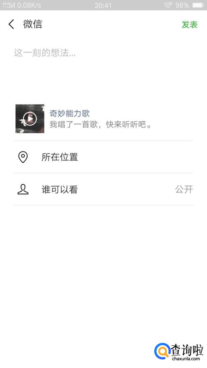 例如选择分享到朋友圈,输入自己此刻的想法,点击发表就分享出去了。