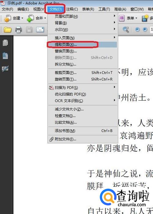 当然,我们大多数时候看到的PDF是以文档的形式存在,即存在很多页面,这时,我们要插入PDF,需要把所需要的PDF页面从文档中单独提取出来,然后再导出图片格式。具体做法是点击页面上的“文档”标签,在下拉菜单中选择“提取页面”,然后提取所需页面就可以了。
