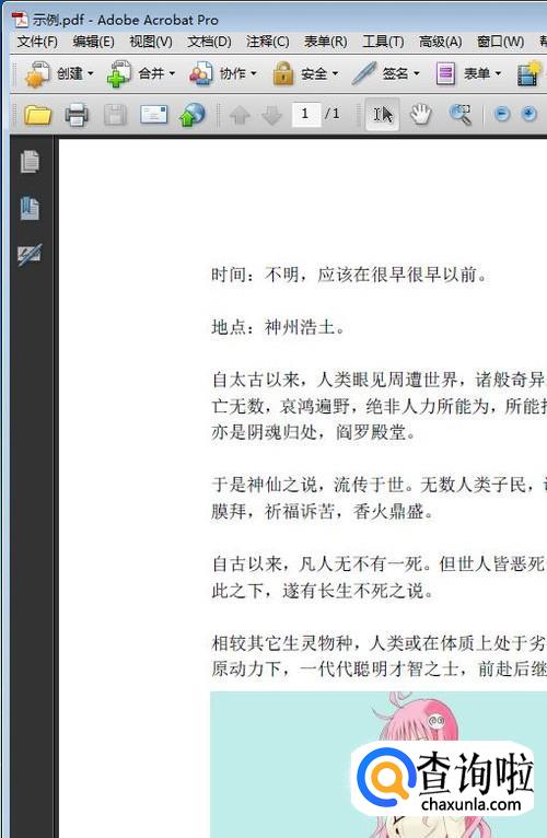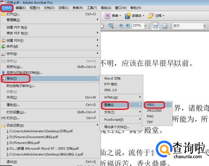 用Adobe Acrobat Pro软件打开该PDF页面,点击“文件”,在下拉菜单中选择“导出”,然后依次在扩展菜单中选择“图像”、“JPEG”,则PDF格式页面就转变成图片了,我们把它也命名为“示例”,不过格式是图片。