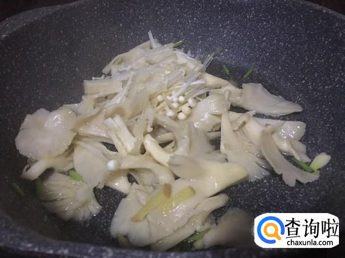 先放入凤尾菇翻炒之后再放入金针菇翻炒,不要加水,菇类会出水