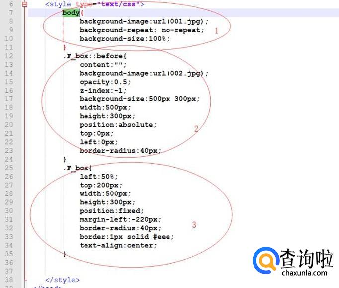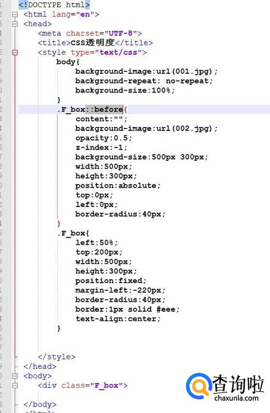 下面简单分解下代码,分为1,2,3,第一部分,设置背景图片001.jpg;第三部分,固定前置层图片002.jpg的位置;第二部分,利用伪元素::before,设置属性opacity来调节透明度,取值为0-1,0是全透明,即看不见的效果,1是全不透明