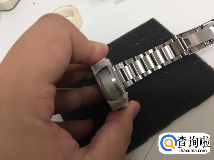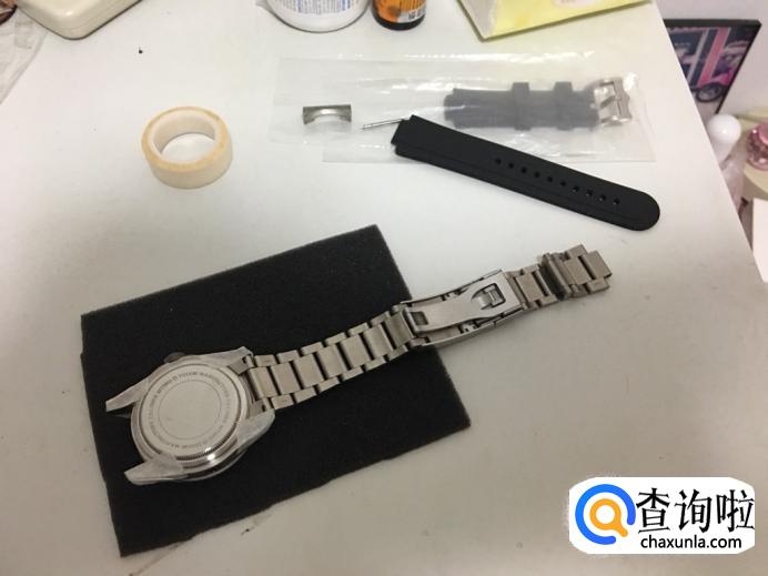 可以看到,能够使表带固定在表盘上的结构是插销的作用,那么我们要做的就是用拆表工具将金属表带拆下,把皮质表带挂上去。
