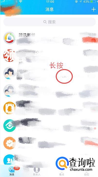 在QQ内的消息页,选择联系人头像右侧长按空白区域