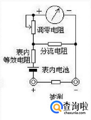 测电阻:在表头上并联和串联适当的电阻,同时串接一节电池,使电流通过被测电阻,根据电流的大小,就可测量出电阻值。改变分流电阻的阻值,就能改变电阻的量程。