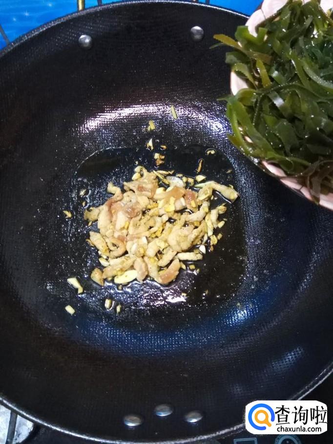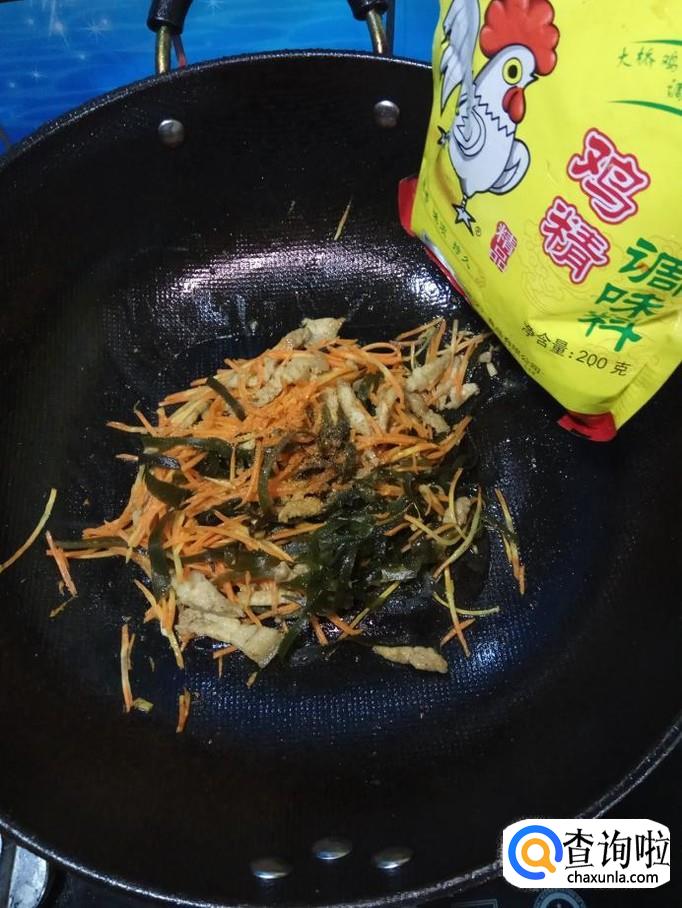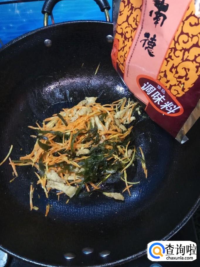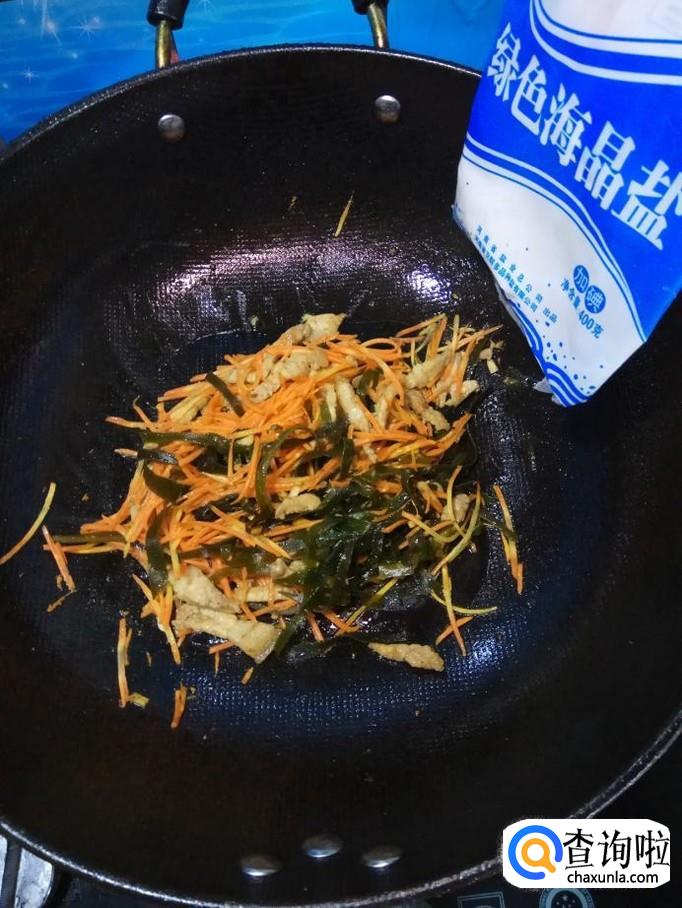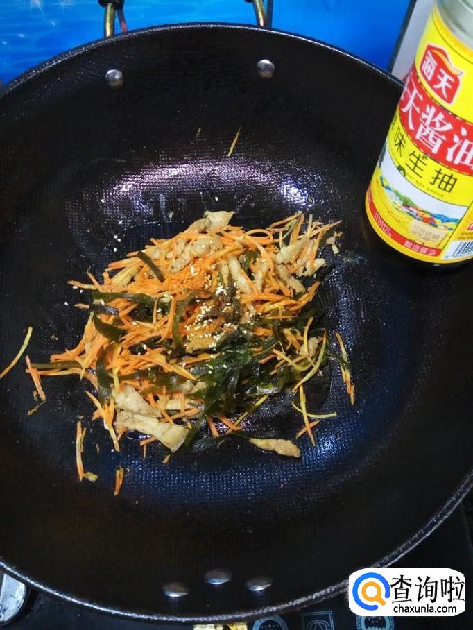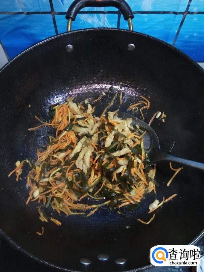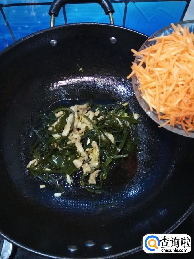 将准备好的海带丝和胡萝卜丝倒入锅中,翻炒均匀。