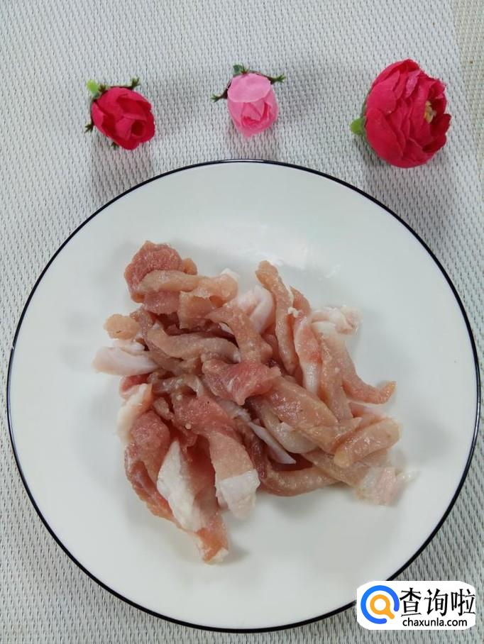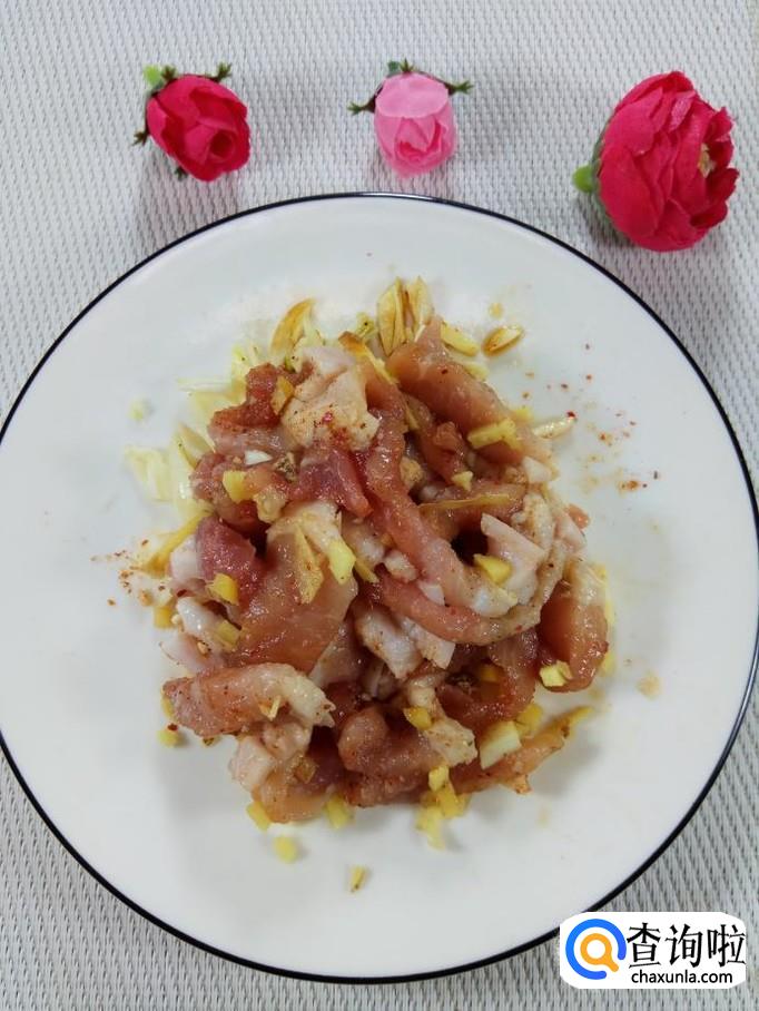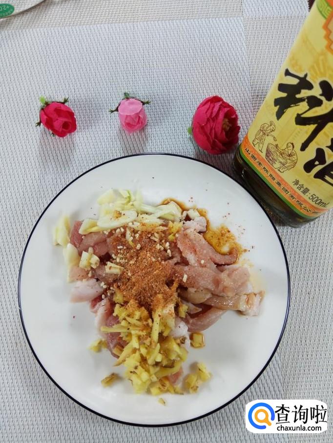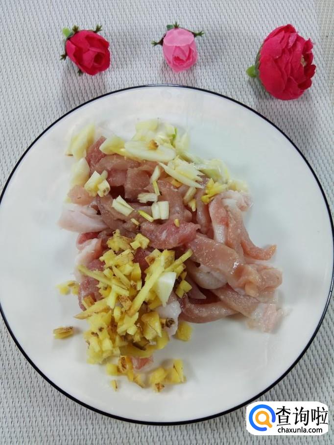 准备适量猪肉,洗净后,切成肉丝,放入盘中,再准备适量的姜和蒜,洗净后切碎,放在上面。