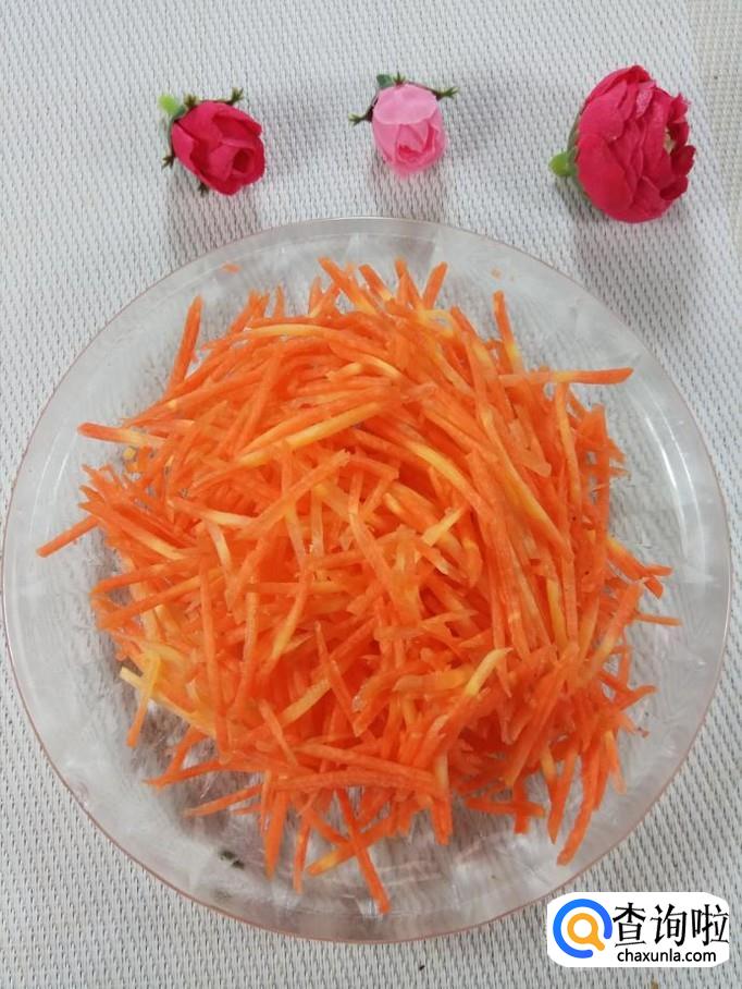 准备适量胡萝卜,洗净后去皮,切成细丝;再准备适量海带丝,用清水泡开,放入锅中,稍微煮一下,捞出,沥干水分备用。
