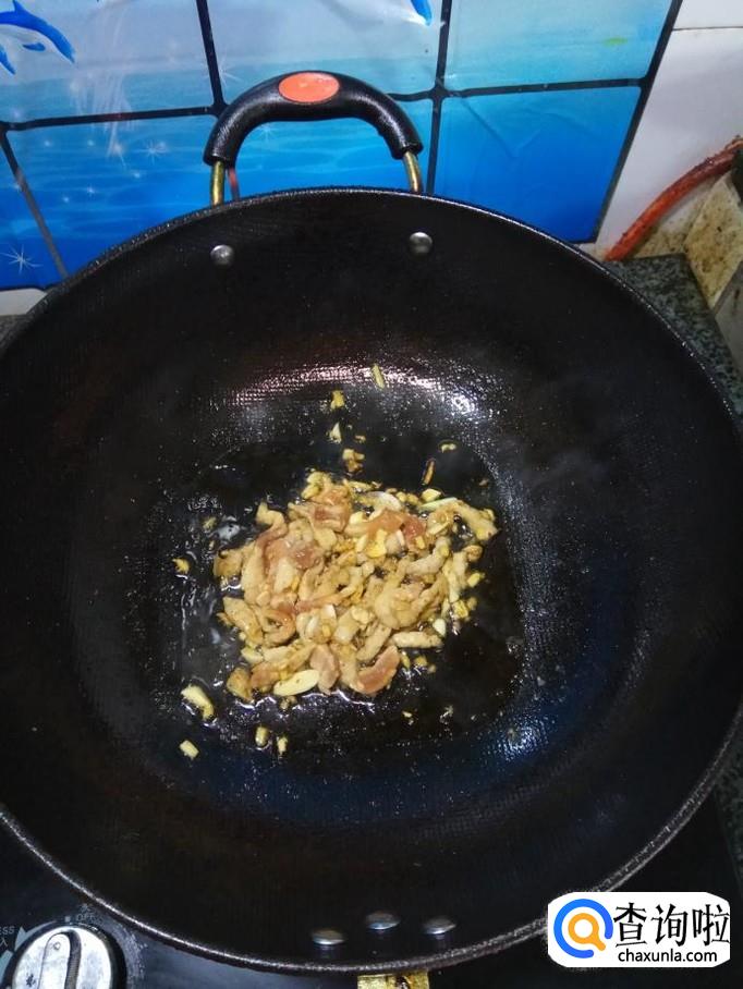 炒锅中放入适量油,油热后将腌好的肉丝倒入锅中,炒至八成熟。