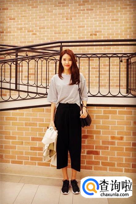 横细条纹宽松衫搭配一条黑色金丝绒阔腿七分裤非常适合金秋季节穿搭的,脚上一双今年很流行的老爹鞋既舒服还非常的时尚。