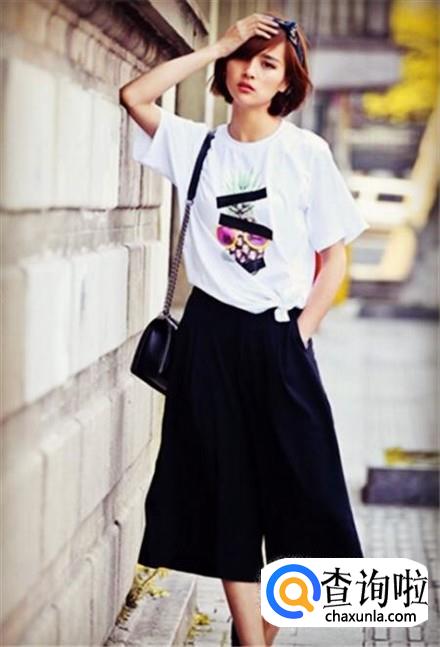 这身搭配比较适合夏秋交替季节,肥肥大大的黑色金丝绒阔腿裤搭配一件印花白色T恤,随便搭配一双小白鞋就可以了。