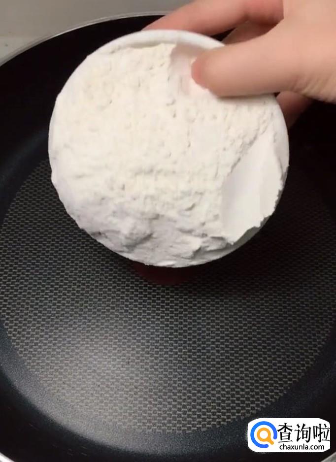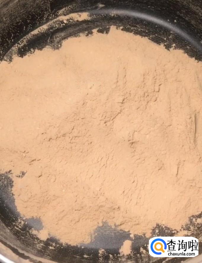 首先我们在一个干净的锅中倒入一碗面粉,大火炒三分钟转小火,炒至面粉变成深黄色关火