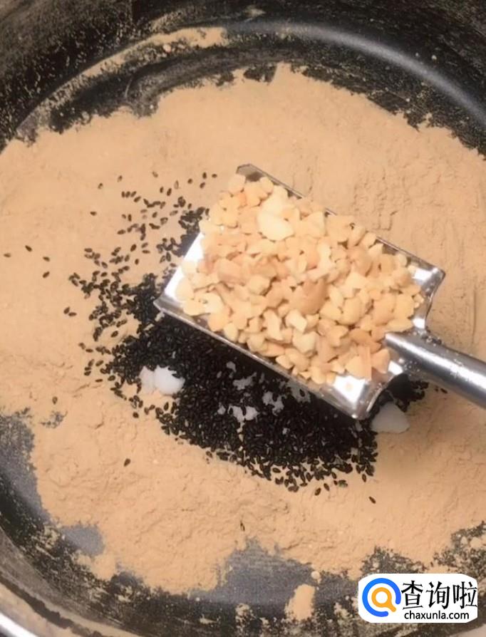 然后我们倒入一勺白糖,适量的花生碎与熟芝麻,翻拌均匀