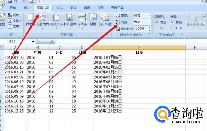 打开Excel表格,我们在Excel表格的最上面的菜单栏中找到“页面布局”选项,然后再找到里面的“宽度”、“高度”调节设置。这个设置主要是针对打印时的行间距设定的,在打印时才会看出来最终的行间距是怎样。