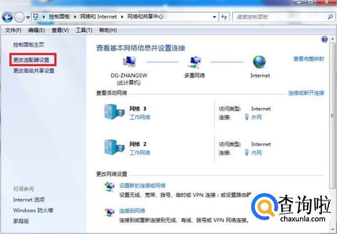 在“网络和共享中心”界面的左侧列表中,点击“更改适配器设置”选项。