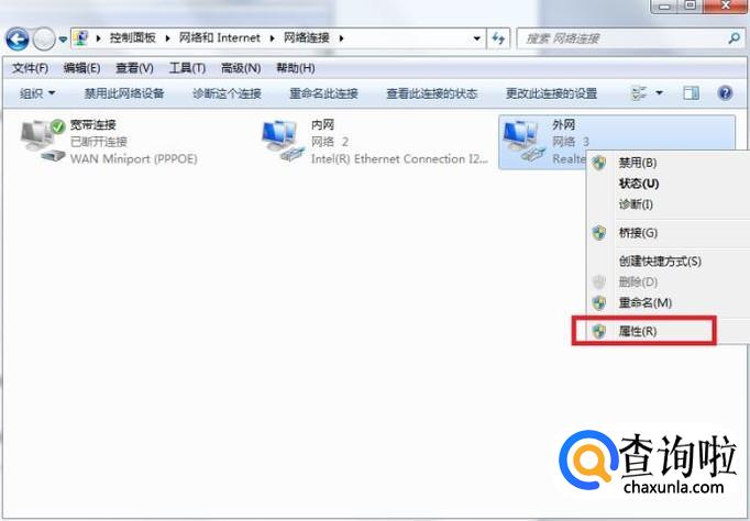 在“网络连接”界面中,使用鼠标右键点击正在使用的网络连接,在弹出的操作选项中点击最下方的“属性”选项。