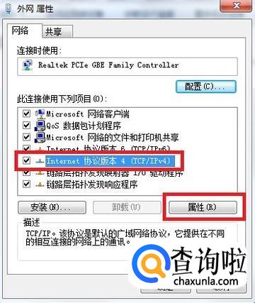 在网络连接的属性界面,选择此连接使用下列项目中的“Internet 协议版本 4(TCP/IPv4)”后,点击项目列表右下方的“属性”按钮。