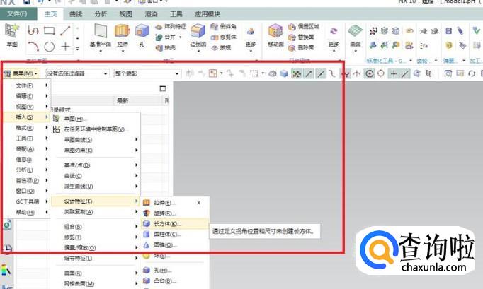 如下图所示,执行【菜单】【插入】【设计特征】【长方体】的操作,这是激活长方体的方式。