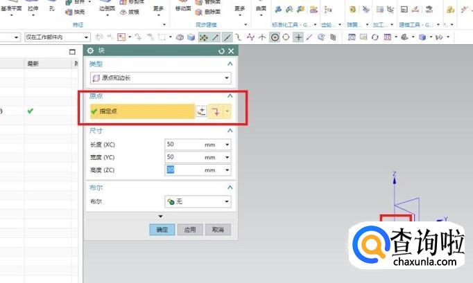 因为上一步先设置了尺寸,那么这里就设置原点了,这个原点与坐标系的原点不同,它是长方体的起点,我们可以随意指定一个点,所以我们也可以采取默认的原点(坐标系原点)