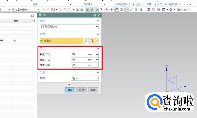如下图所示,默认的尺寸全是100,我给改成了长50,宽50,高30,这是为了方便给你们演示。