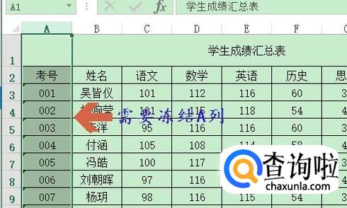 那么如果我们想要冻结表格中的首列,又该如何操作呢?加入我们需要冻结下图中的A列,如图所示...